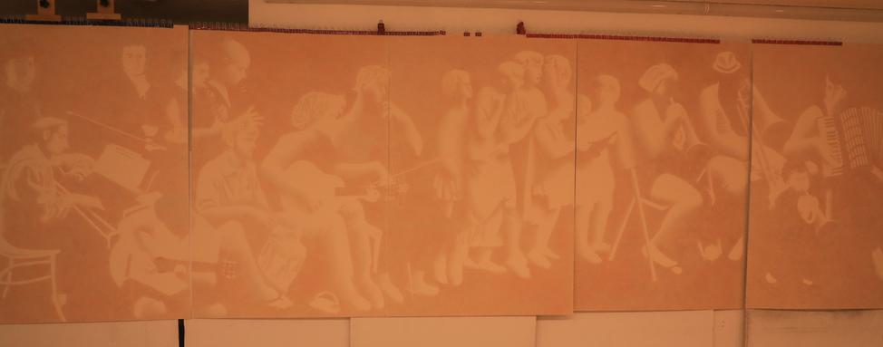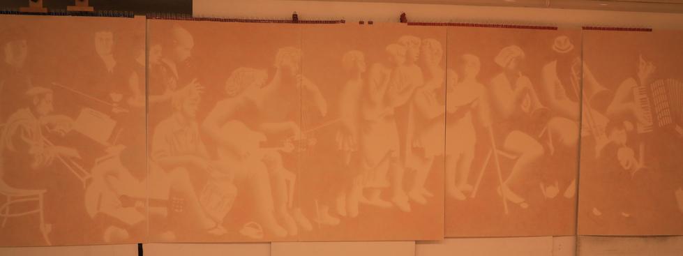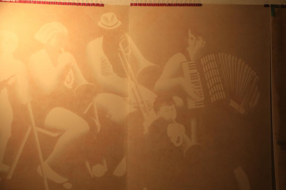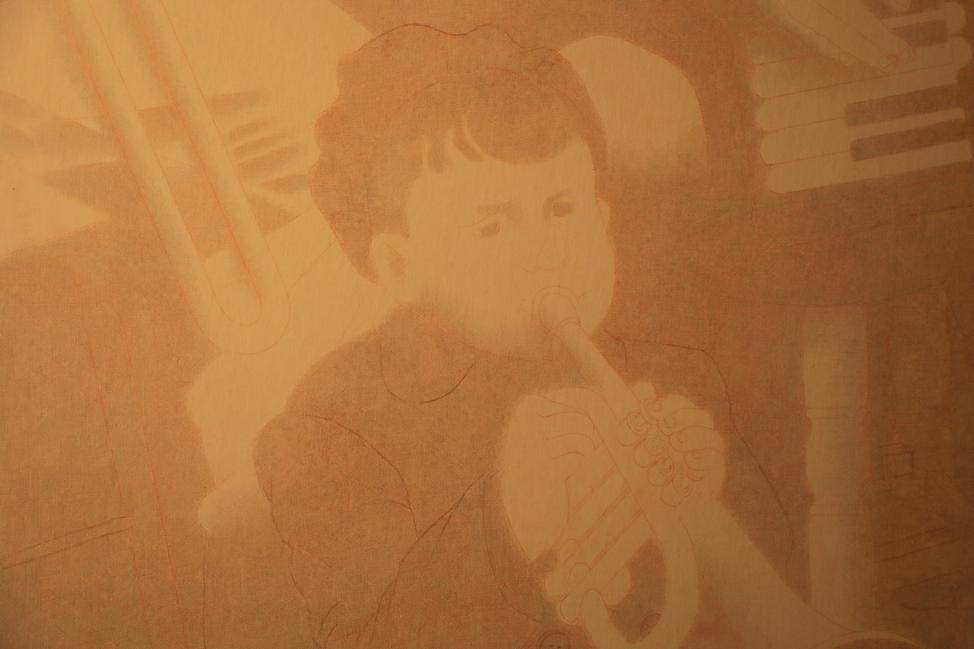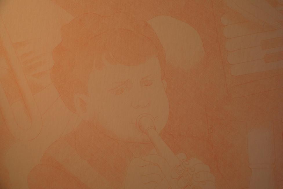Tom: the drawing you sent me, i think it's much much better drawing with the baby, without the baby, it just becomes something everyone can understand, but the baby add the quality, why there is a baby lay in the middle of the foreground? So by adding that little element, people can't explain, it doesn't make sense, it totally changed that picture, it becomes less traditional normal picture, something mystery, something makes people think, so it makes it so much better. It doesn't hear the music as well as other people, he doesn't understand everyone is so talented making the music.